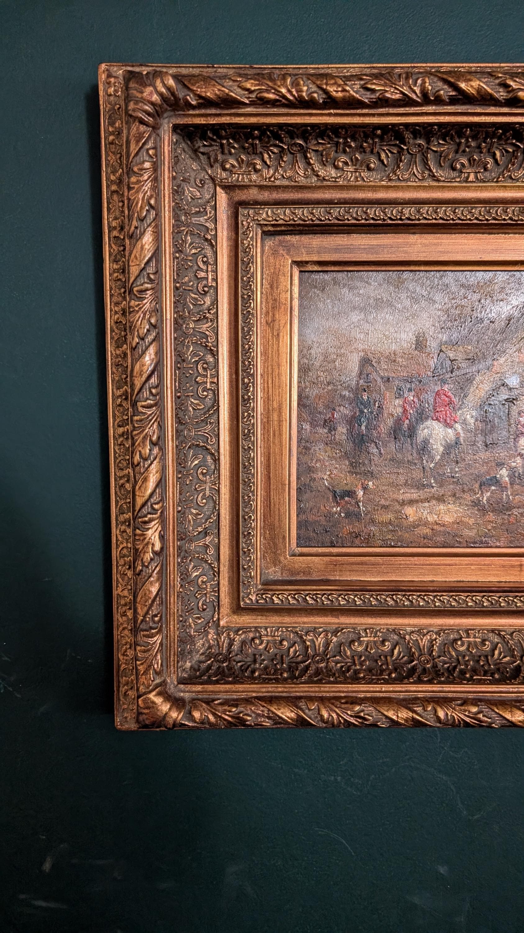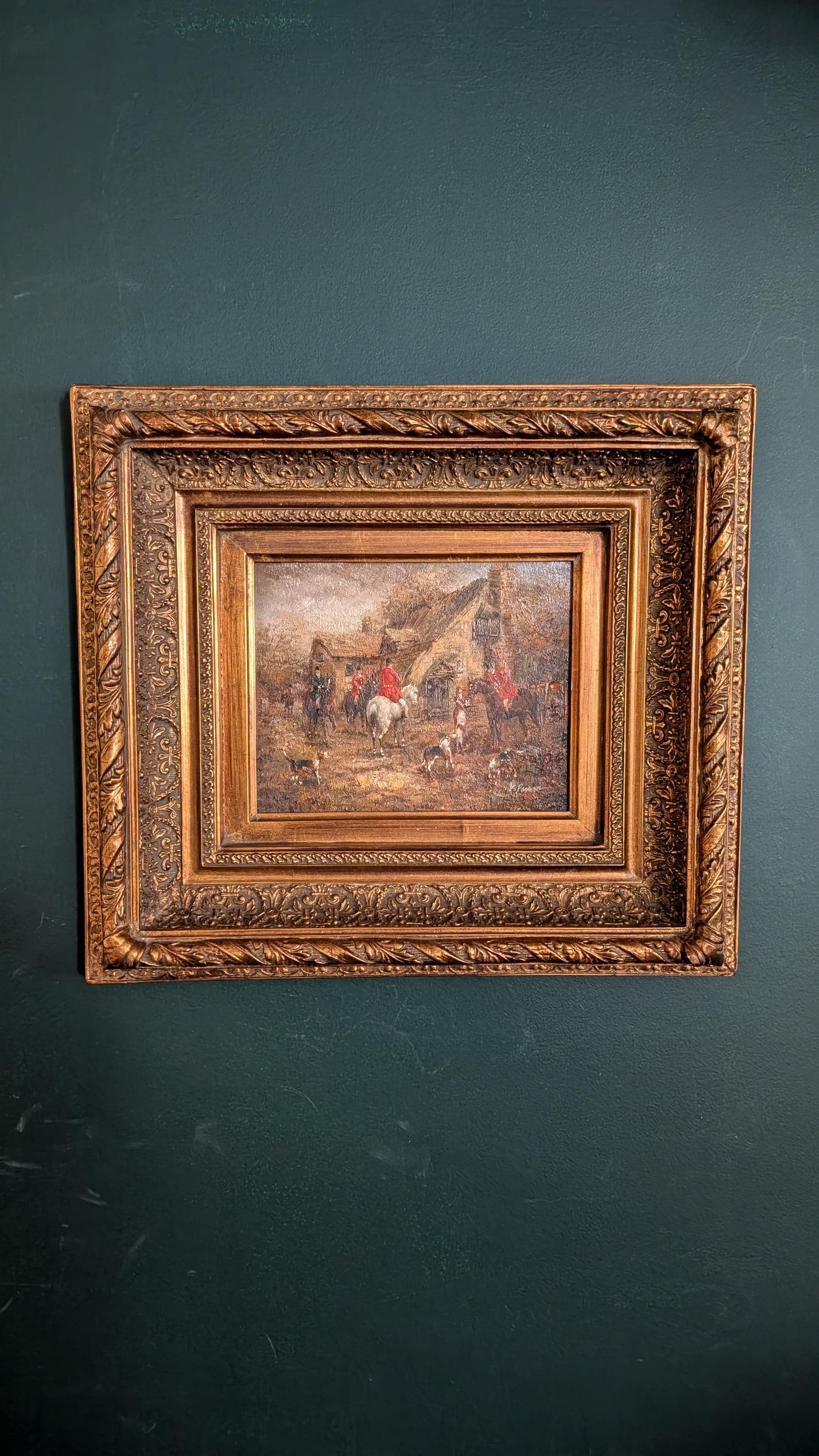 Original Authentic Vintage Equestrian Chasse a courre signed oil on Board in Frame. Fox hunting scene