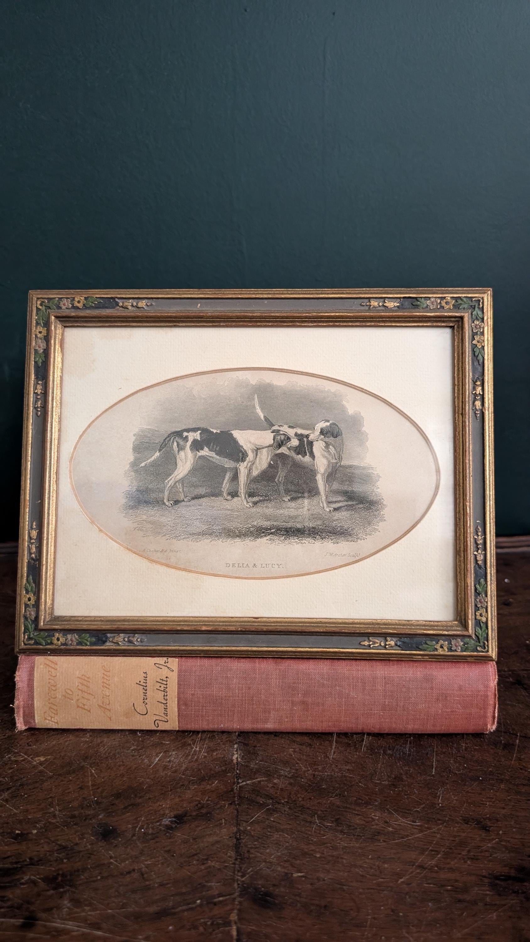 Antique Dog " Delia & Lucy" Engraving in original Victorian Floral Frame