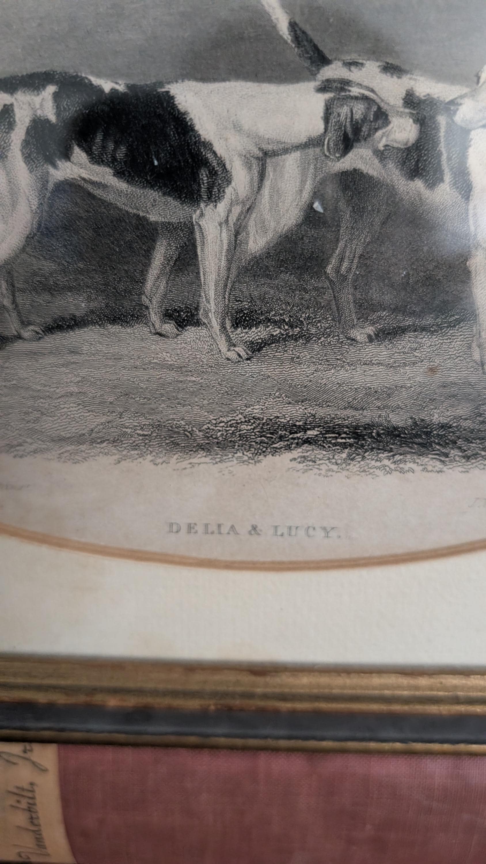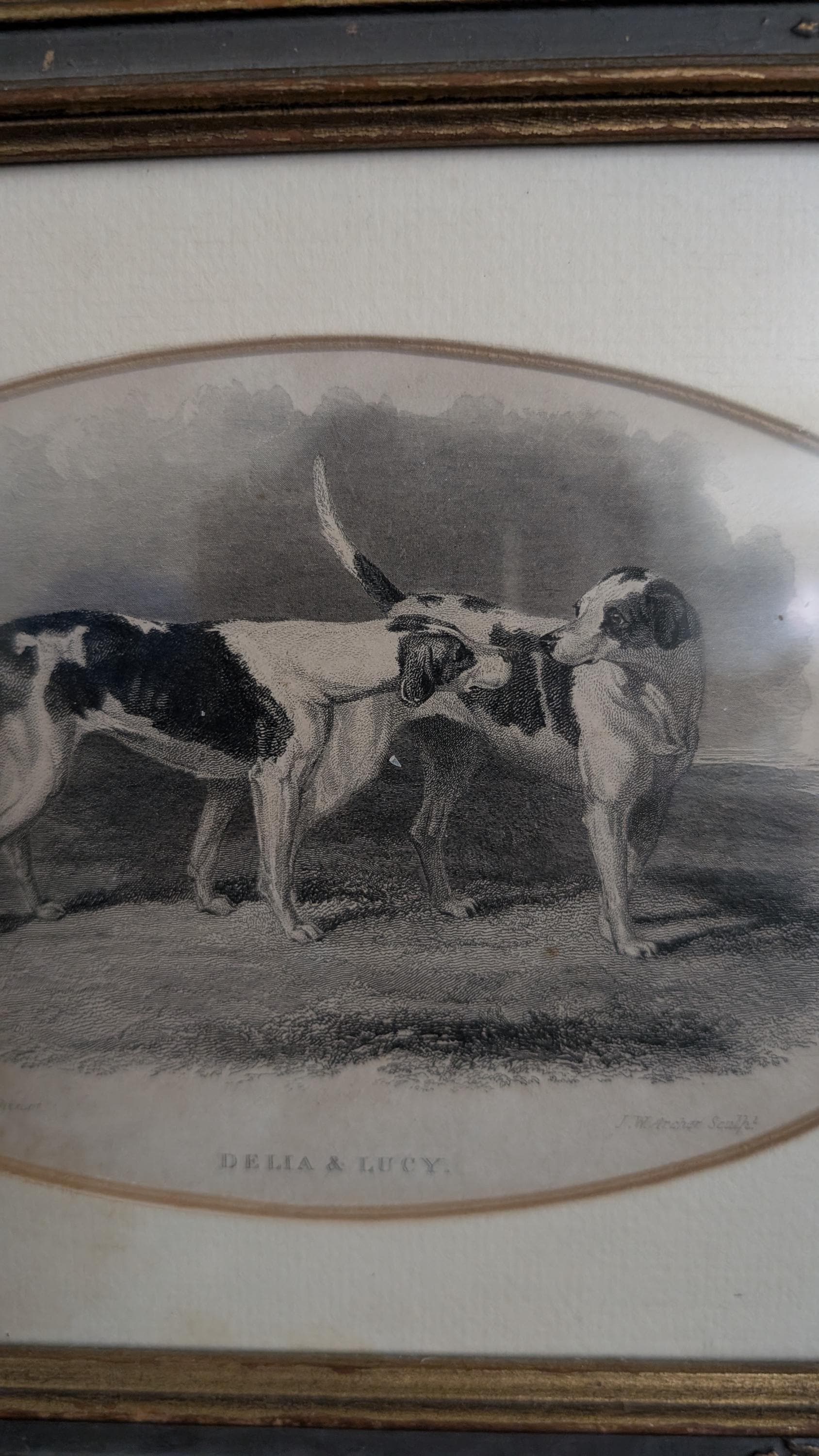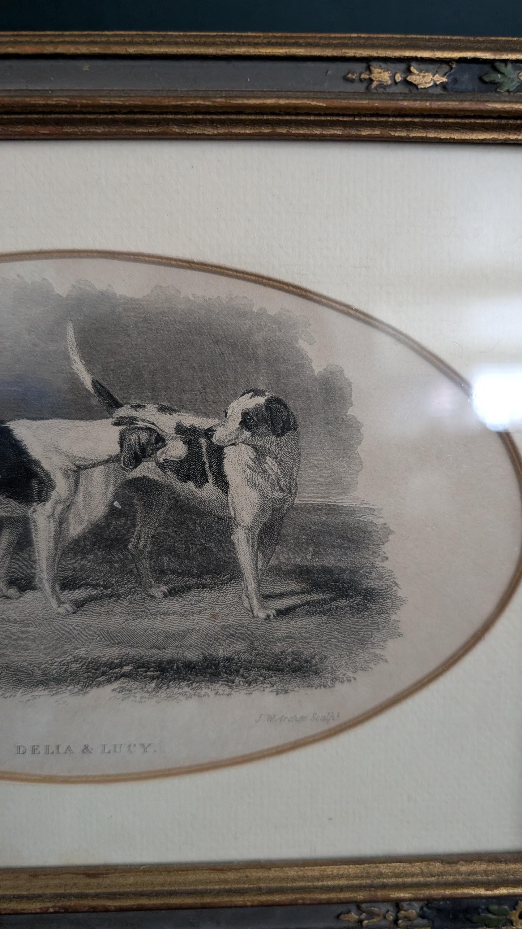 Condition: Beautiful engraving of two dogs " Delia & Lucy" in ornated original frame. Overall great condition for advanced age.