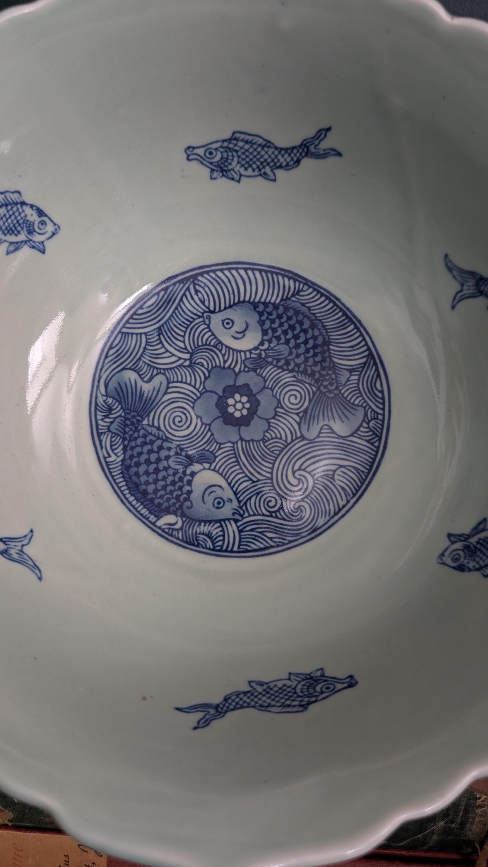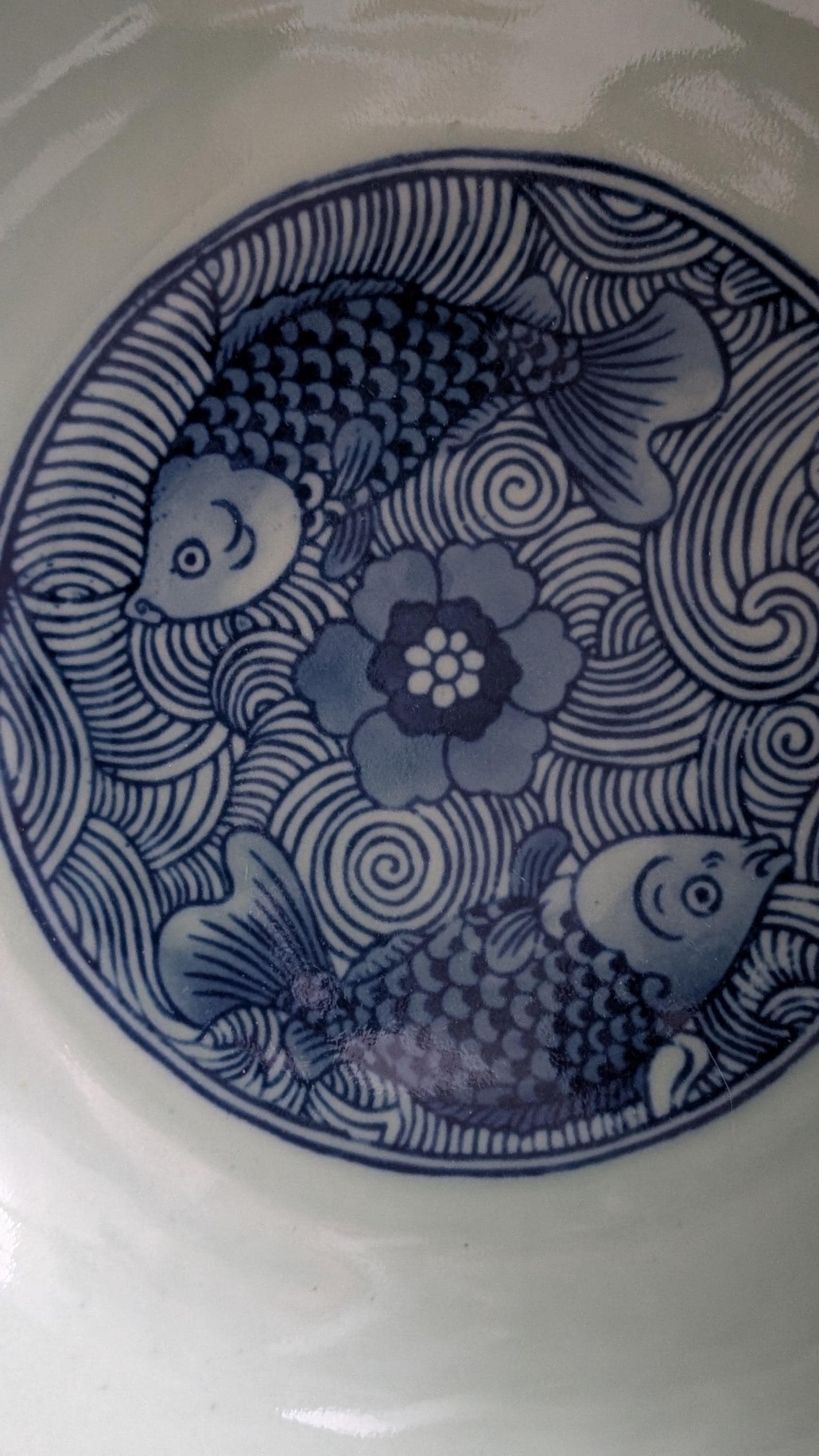 Condition & Description: Stunning large Qinglong style signed bowl likely made in the early 1900 depicting Koi Bowl.